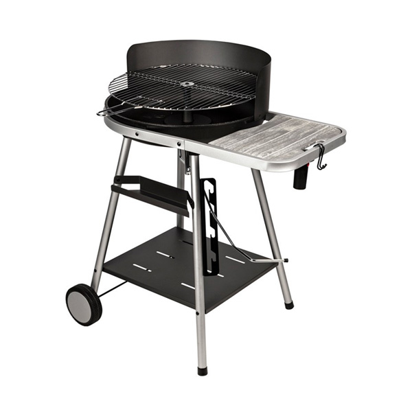 Μαντεμένια ψησταριά με αντιανεμική προστασία και μεταφερόμενη μεταλλική βάση με ρόδες και πλαϊνό χερούλι.